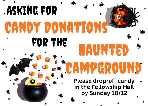 We will be participating in the Haunted Campground event again this year and are requesting that candy donations be dropped off at the church by Sunday, October 12th.