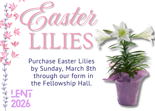 Order Your Easter Lilies now in honor or memory of a loved one. They cost $13.75. Please fill out an order form with cash or check by March 8th and put it in the green envelope on the Welcome table in the Fellowship Hall or give to the office. Questions? Ask Susie Clower.