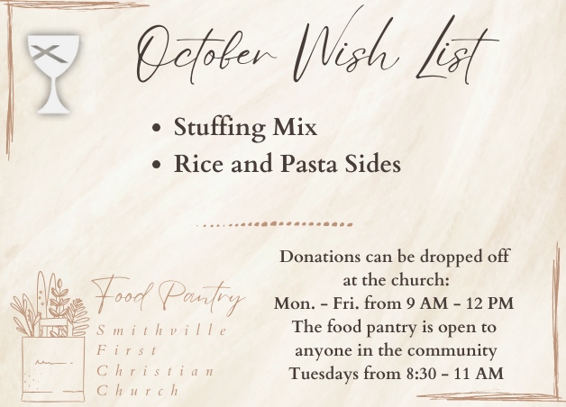 For the month of October, we are collecting non-canned items for the Blessing Box and Food Pantry.