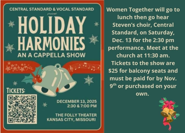 We will go out for lunch and then go hear a Christmas concert by Steven’s choir, Central Standard, at the Folly. Tickets are $25 each for balcony seats. Sign up and pay by Nov. 9 to be seated together, or purchase tickets on your own for Dec. 13th, 2:30 pm show. Meet at the church at 11:30 am to carpool.