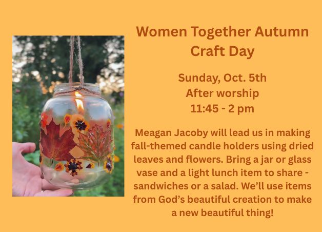 Women Together Autumn Craft Day is Sunday, Oct. 5th, After worship (11:45 – 2 pm). Meagan Jacoby will lead us in making fall-themed candle holders using dried leaves and flowers. Bring a jar or glass vase and a light lunch item to share – sandwiches or a salad. We’ll use items from God’s beautiful creation to make a new beautiful thing!